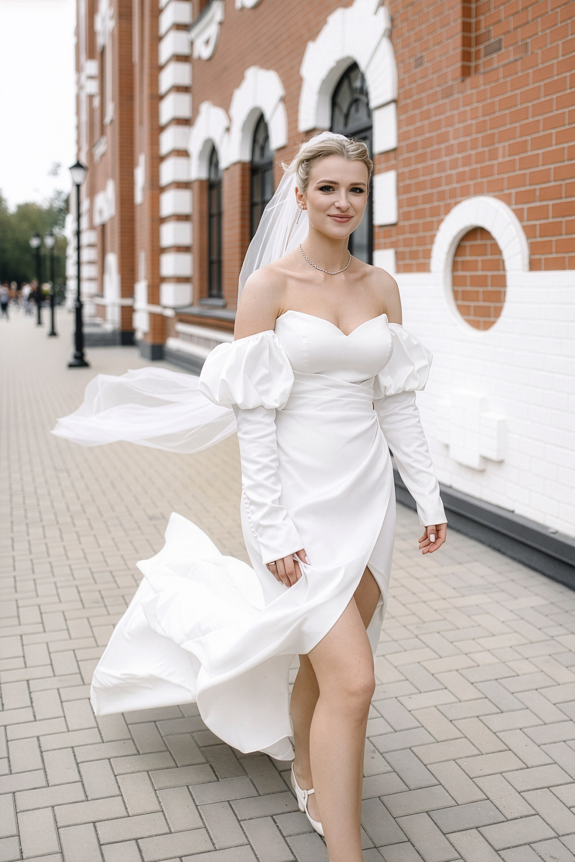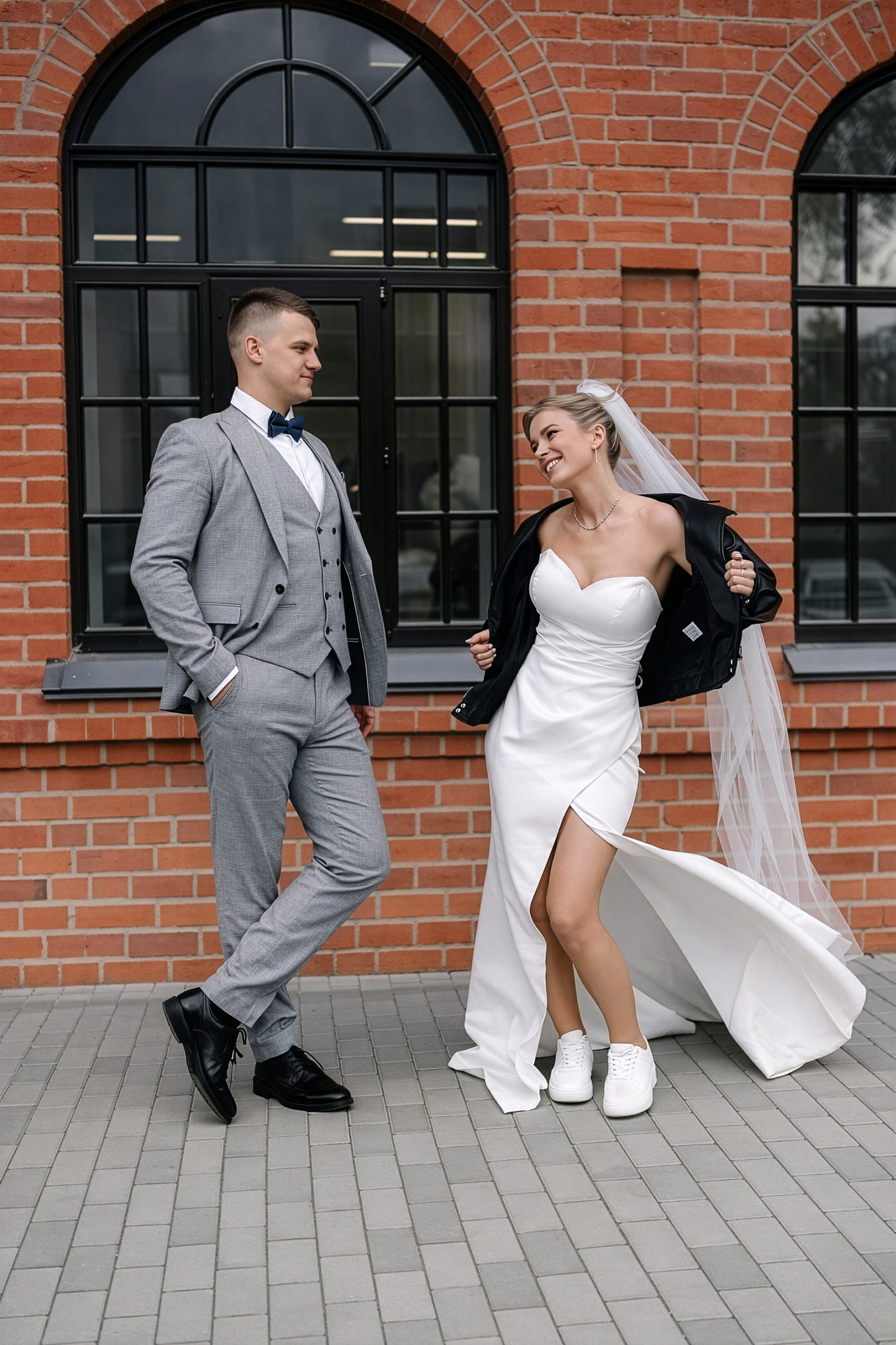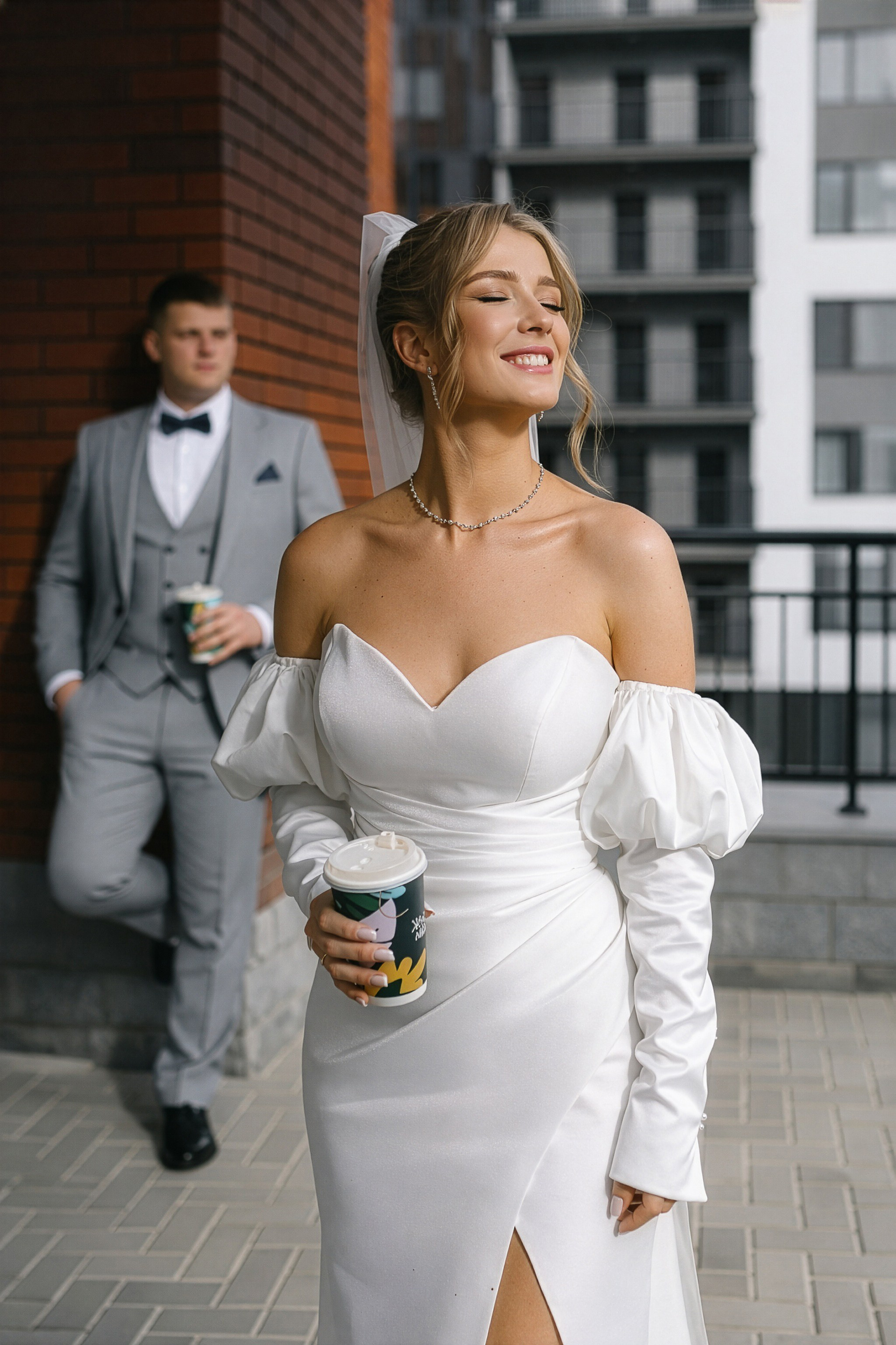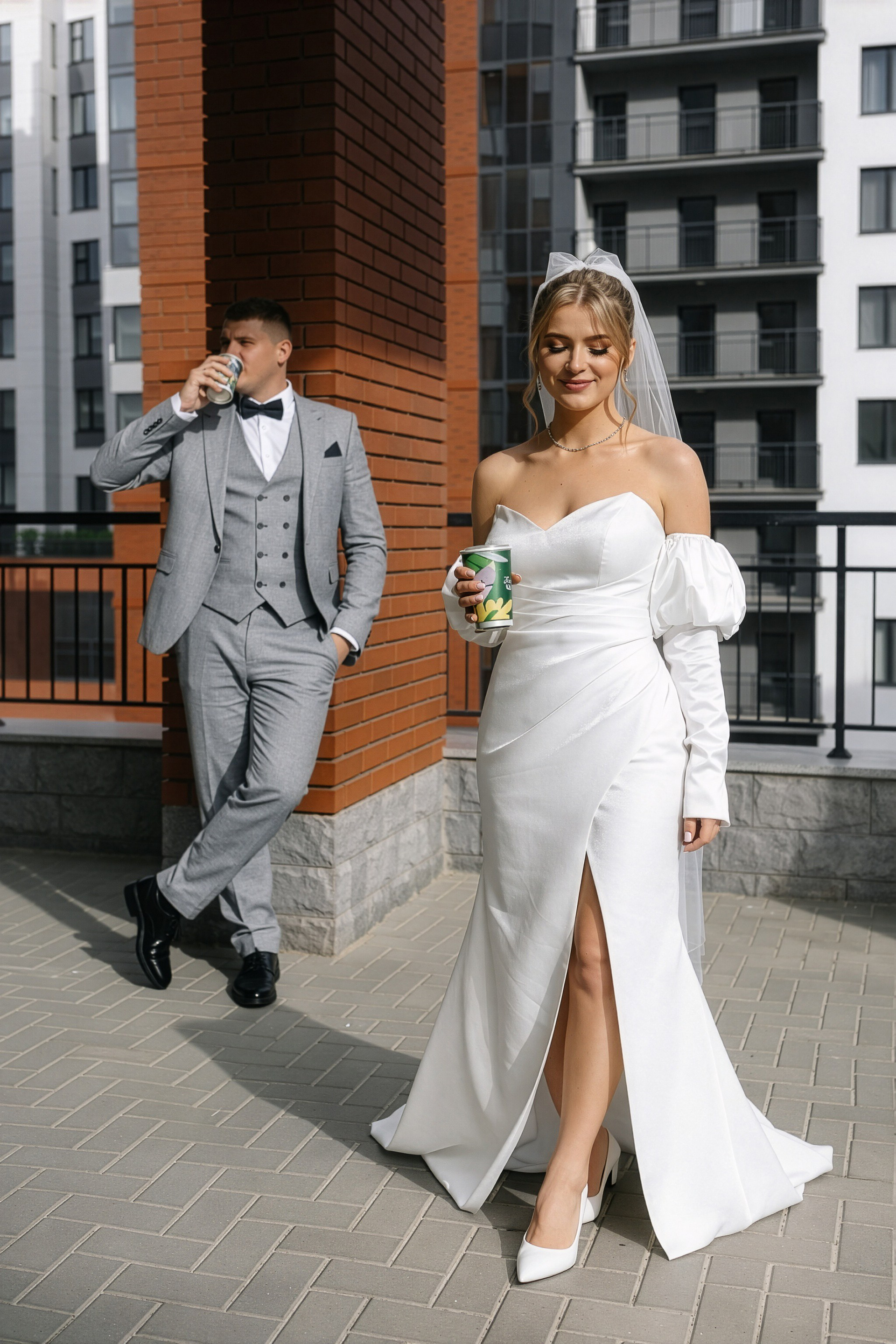 - Игра на контрастах: Нежность свадебного платья на фоне брутальных городских стен.