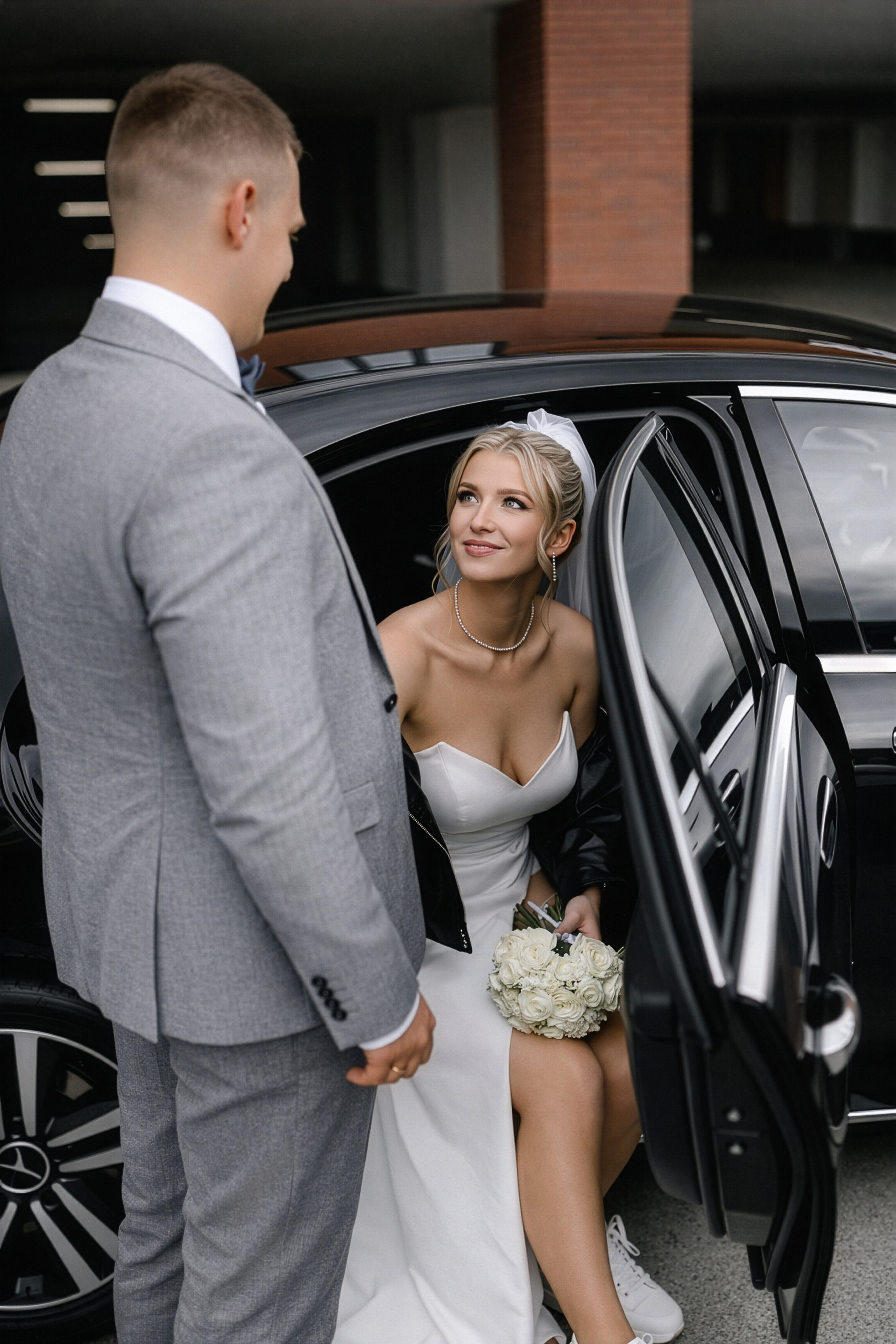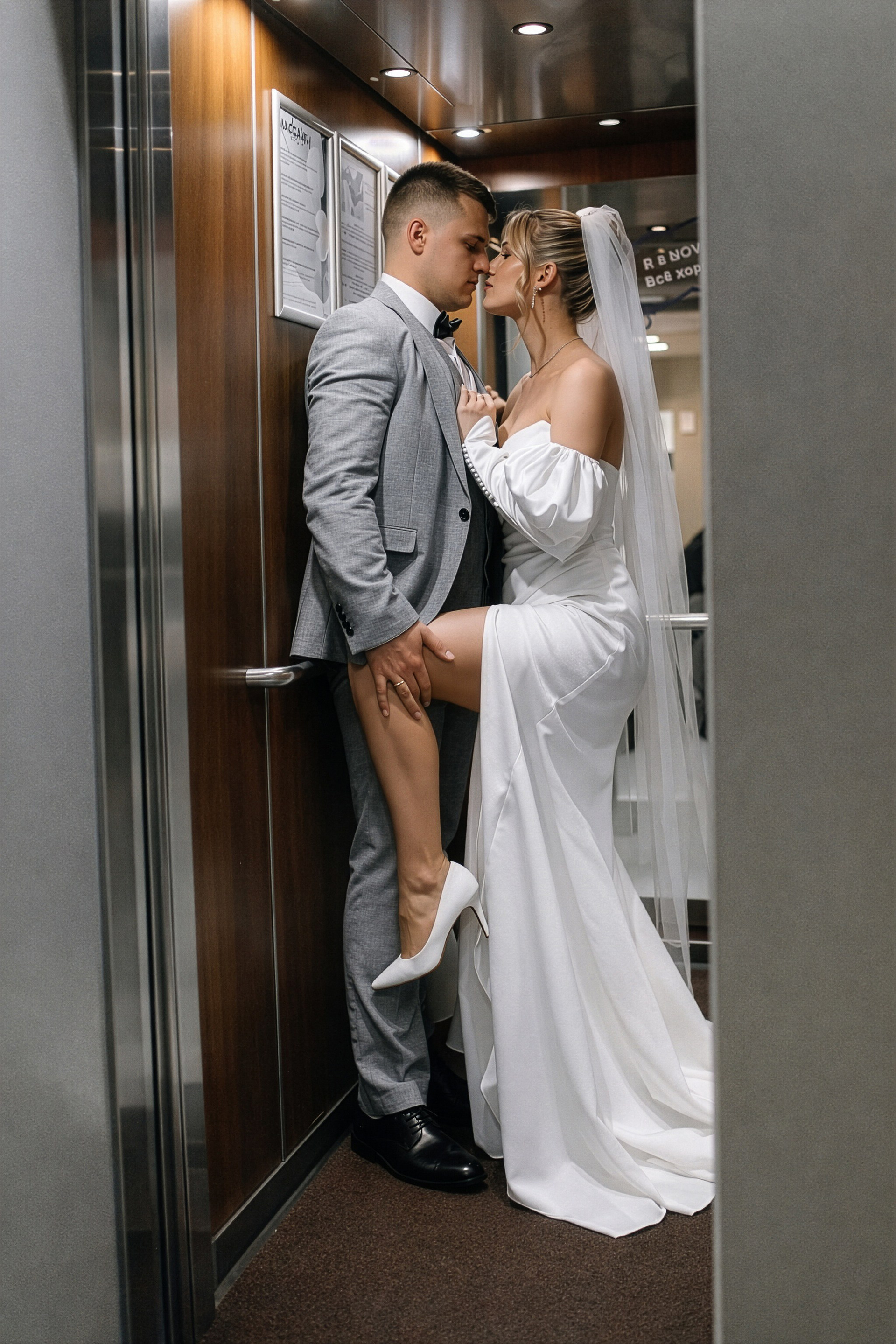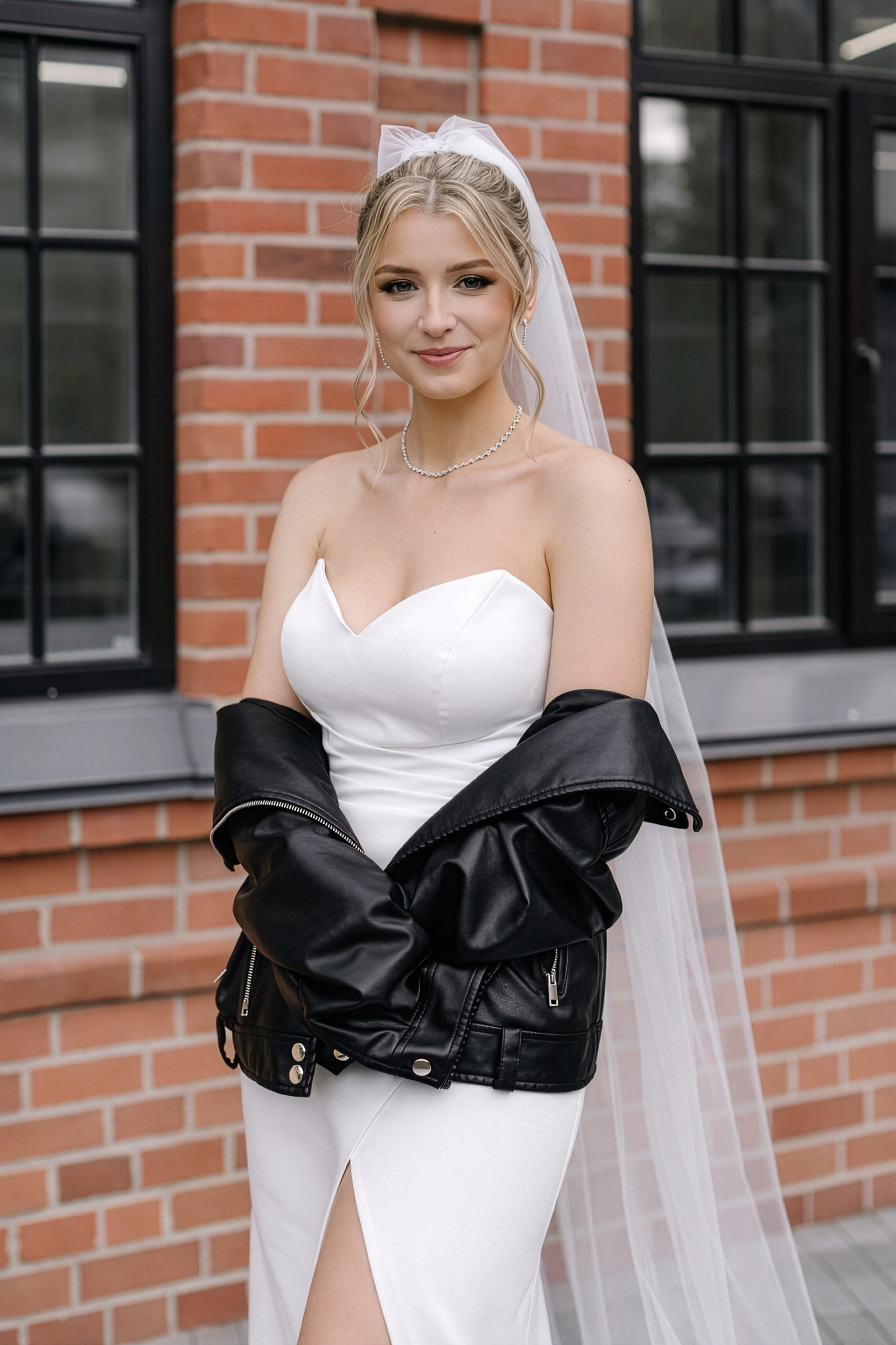 - Игра на контрастах: Нежность свадебного платья на фоне брутальных городских стен.